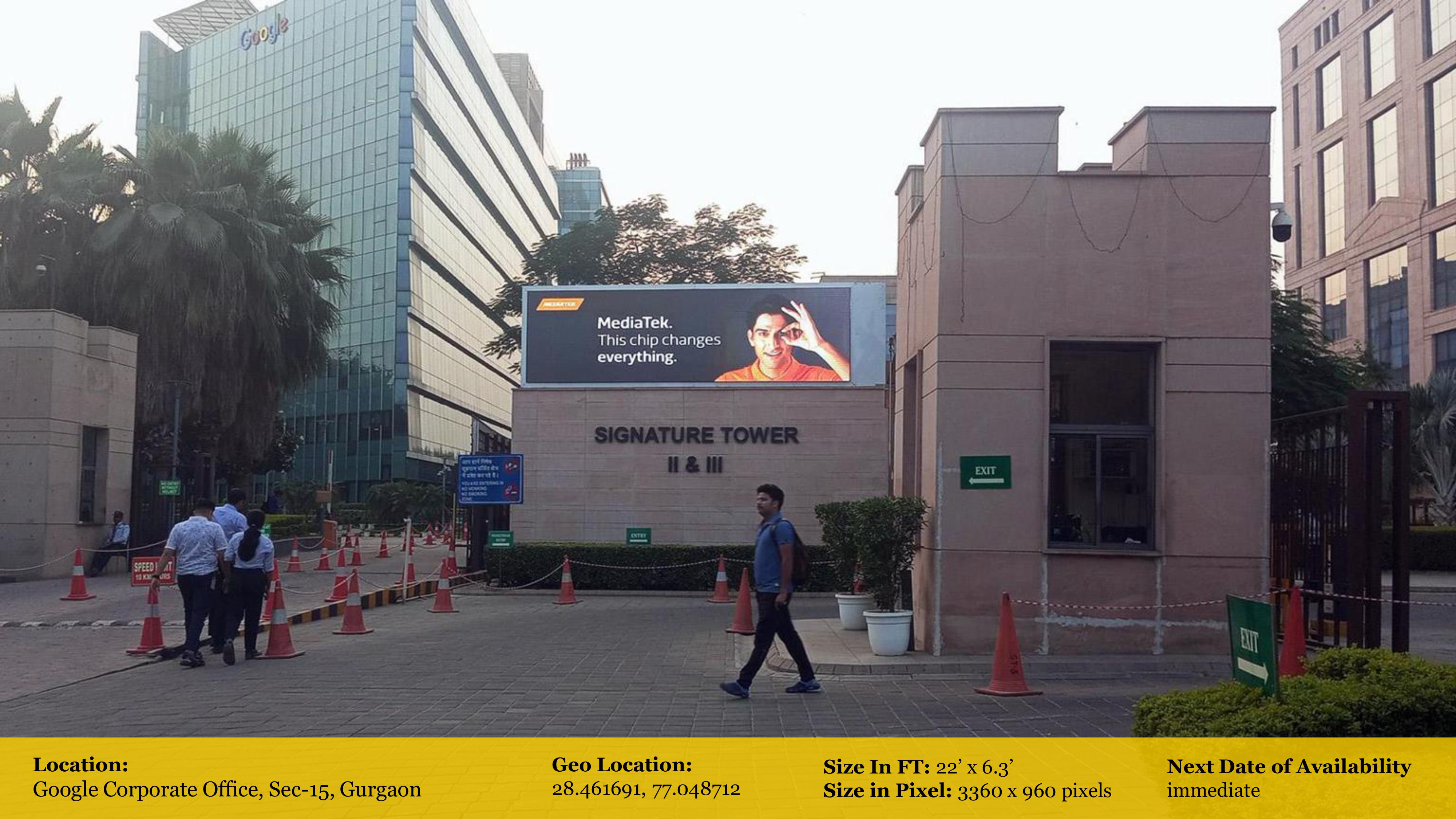 This digital billboard is strategically located at Google corporate office, Sector 15 in Gurugram. This prime location offers excellent visibility and accessibility to your target audience throughout the day. The billboard's positioning ensures maximum impact for your advertising campaign.