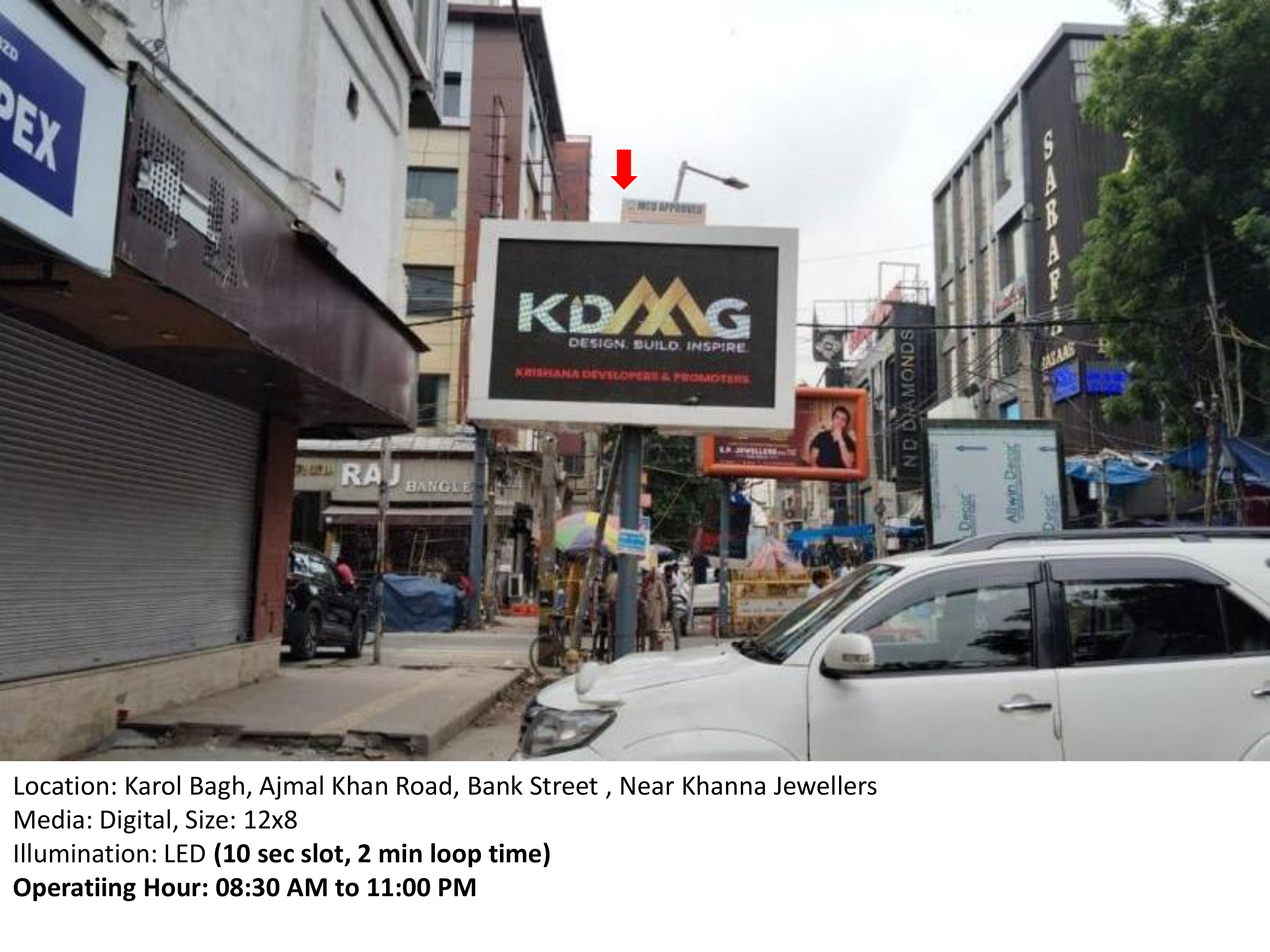 This digital billboard is strategically located at Karol Bagh, Ajmal Khan Road, Bank Street, Near Khanna Jewellers in Delhi. The stretch connects major arterial roads and transit points, guaranteeing high footfall and vehicular traffic. The billboard's positioning ensures maximum impact for your advertising campaign.