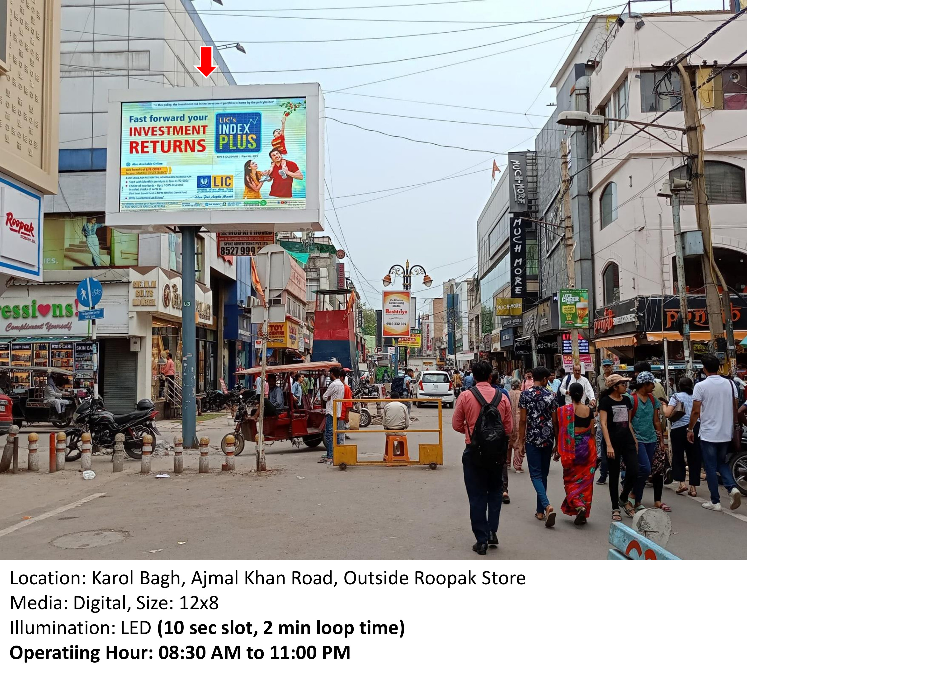 This digital billboard is strategically located at Karol Bagh, Ajmal Khan Road, Outside Roopak Store in Delhi. The stretch connects major arterial roads and transit points, guaranteeing high footfall and vehicular traffic. The billboard's positioning ensures maximum impact for your advertising campaign.