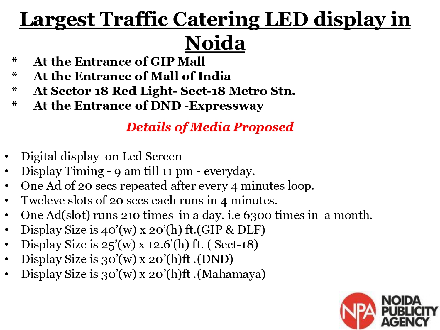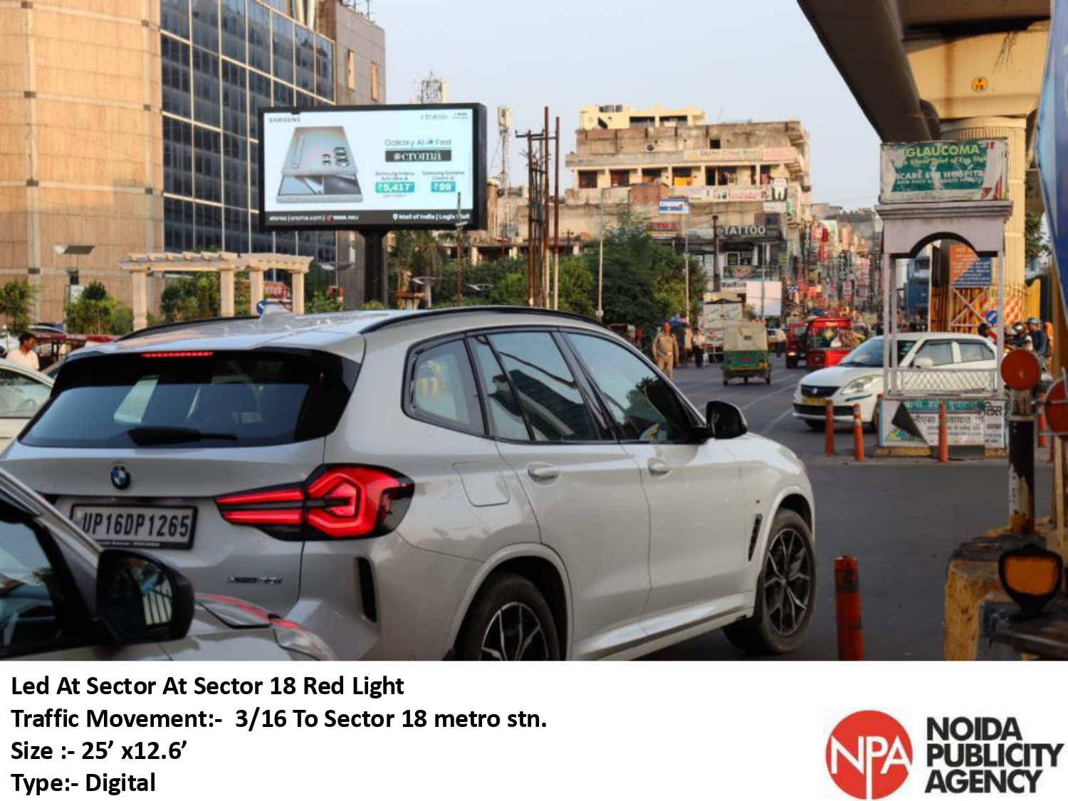 This digital billboard is strategically located at Sector 18 Red Light in Noida. This prime location offers excellent visibility and accessibility to your target audience throughout the day. The billboard's positioning ensures maximum impact for your advertising campaign.